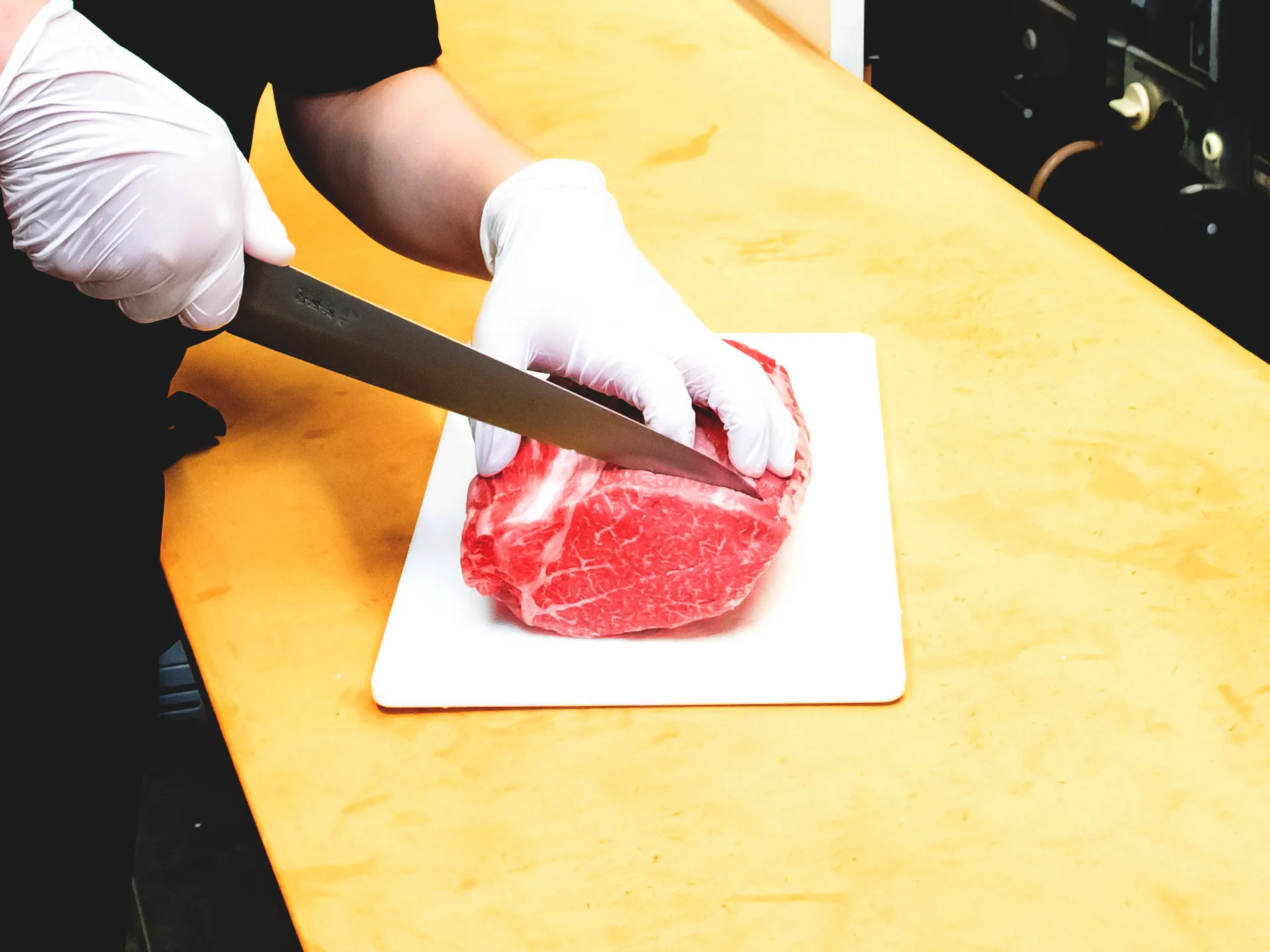 焼く直前に、塩とコショウを肉の片面に、均一になるようにふりかけておきましょう。目で見て触って明らかに硬いすじがある場合だけは、すじ切りをしておきます。